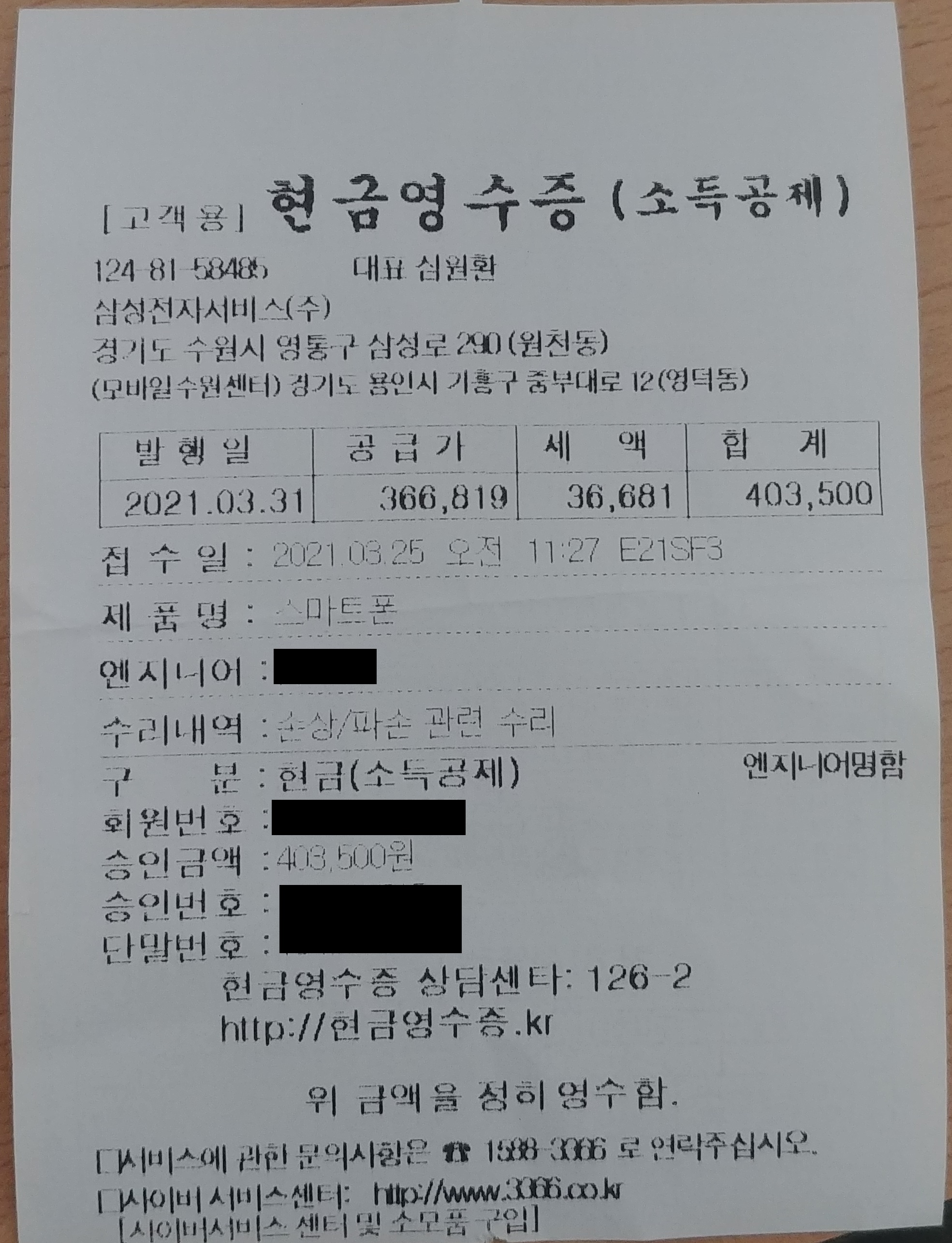 (알게 된 점: 내부액정만 교체하는 것을 단품수리라고 하는데 전국에서 여기, 영통 수원삼성에서만 가능하답니다. 다른센터 가면 전체수리 하고 56만원인가 한다 하네요)